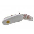 Corte realizado en material textil con divertido estampado multicolor, sin contrafuerte, forro interior textil con plantilla extraíble, cierre mediante doble velcro ajustable, suela sintética fina muy ligera y adherente.