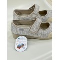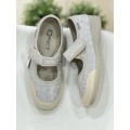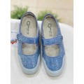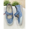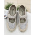 Corte realizado en material textil con brillos, forro interior textil con plantilla extraíble para mayor confort, cierre mediante velcro muy fácil de quitar y poner, suela de goma con gran adherencia.