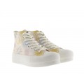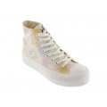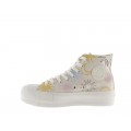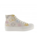 Corte alto realizado en algodón con detalle de parche a la altura del tobillo y estampado multicolor de soles, forro interior textil (100% algodón), cierre mediante cordones al tono y suela de plataforma con una altura de 4cm. Altura de la caña 9.5 cm.