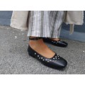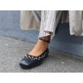 Corte realizado en piel natural con diseño de punta cuadrada y detalle de tachuelas en color plata, forro interior con plantilla de piel acolchada, cierre mediante hebilla ajustable en la tira del tobillo, suela sintética muy ligera con gran adherencia.