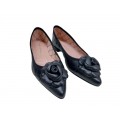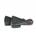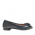 Corte realizado en piel natural con acabado acolchado y adorno en el empeine, forro interior textil con plantilla de piel muy confortable, taconcito bajo de 1.5 cm y suela antideslizante.