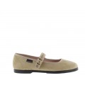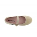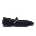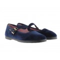 Corte realizado en material textil terciopelo, forro interior textil de microfibra, cierre mediante trabilla con hebilla ajustable y suela de caucho vulcanizado.