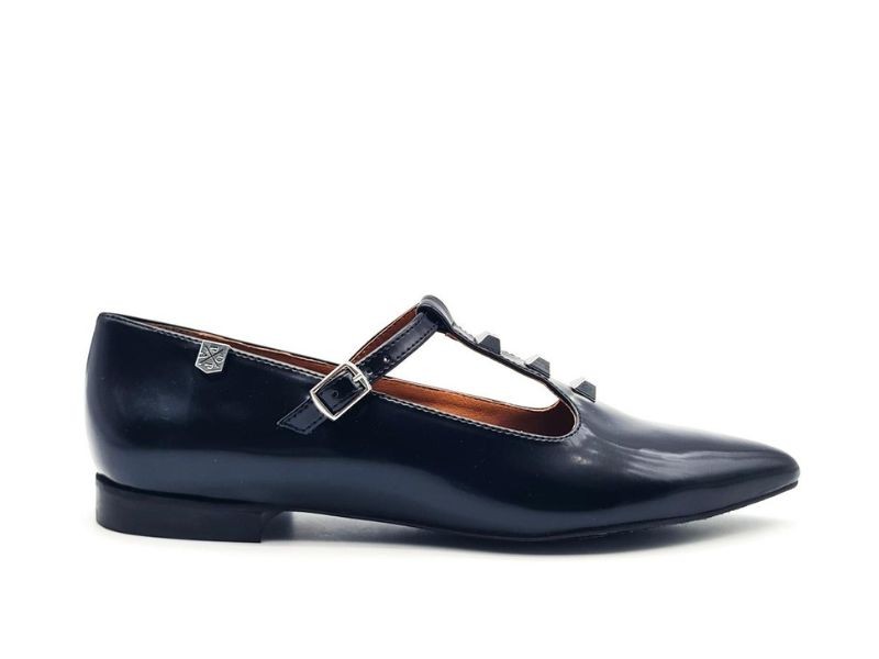 Corte realizado en piel florentic con diseño acabado en punta y detalle de tachas en la parte central, forro interior con plantilla de piel vegana acolchada, cierre mediante trabilla, tacón de 1.5 cm y suela sintética muy ligera con gran adherencia.
