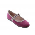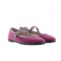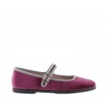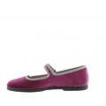 Corte realizado en material textil terciopelo, forro interior textil de microfibra, cierre mediante trabilla con hebilla ajustable y suela de caucho vulcanizado.