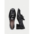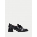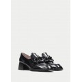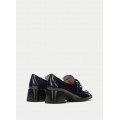 Mocasín con tacón Charlize de Hispanitas HI222338 en color negro para mujer. Corte realizado en piel charol con detalle de maxi cadena en el copete, forro interior de piel natural, incorpora la tecnología Triflow que amortigua cada paso aportando flexibilidad y confort en la pisada, gracias a su triple almohadillado, tacón ancho de 5 cm con suela de poliuretano.