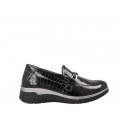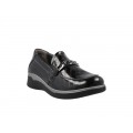 Corte realizado en material sintético efecto coco charol con detalle de cadena en el empeine a modo decorativo, forro interior de piel y textil con plantilla extraíble, la suela es de material sintético de gran adherencia y flexibilidad.