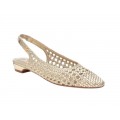 Corte realizado en material textil metalizado haciendo trenzado, diseño acabado en punta, sujeción en el talón con pulsera elástica, suela sintética ligera de gran adherencia.