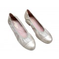 Corte realizado en piel con detalle de puntera cortada y calados en los laterales, horma de ancho especial, plantilla de piel muy confortable que favorece la transpiración, suela sintética muy ligera con tacón bajo de 3 cm. Hecho en España.