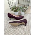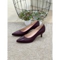 Zapato corte salón Rita Pomares RP0466 en color vino, cuero o azul para mujer. Corte realizado en piel con diseño de punta afilada, forro interior de piel para una excelente transpiración y plantilla de piel acolchada, tacón fino de 5 cm de altura con suela sintética muy ligera y flexible. Fabricación española.