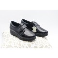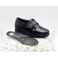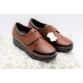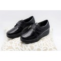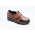 Zapato de piel Manlisa modelo W103-1204 en color negro o cuero para mujer. Corte realizado en piel natural con detalle de coco charol en la puntera, forro interior de piel con plantilla acolchada extraíble efecto memoria, cierre mediante velcro ajustable y suela sintética muy ligera y flexible. Cuña de 3.5 cm y plataforma de 1.5 cm.