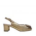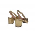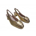 Corte realizado en piel con acabado brillante y chapa dorada a modo de detalle, diseño de escote en pico y destalonado, forro interior y plantilla de piel natural que ofrece un tacto suave y una excelente transpiración, cierre mediante hebilla ajustable a la altura del tobillo, tacón ancho con una altura de 5.5 cm muy fácil de llevar y suela fabricada en material sintético muy adherente y flexible. Fabricación española.