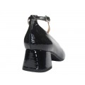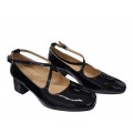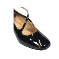 Corte realizado en piel charol con detalle de tiras cruzadas en el empeine, forro interior de piel que proporciona un tacto suave y una excelente transpiración, cierre mediante hebilla a la altura del tobillo, suela sintética de gran ligereza y flexibilidad con tacón ancho de 4cm forrado en charol.