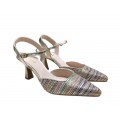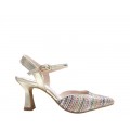 Corte realizado en piel con bonita combinación de colores y escote cuadrado, forro interior de piel con plantilla new gel para mayor confort, cierre mediante pulsera con hebilla lateral ajustable, tacón geométrico con una altura de 7.5 cm y suela sintética muy adherente y flexible.