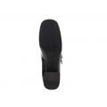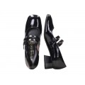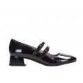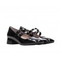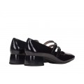 Corte realizado en piel natural con acabado acharolado, forro interior de piel caprina y microfibra, cierre mediante doble hebilla, tacón de 3.5 cm, suela de poliuretano termoplástico de gran ligereza y flexibilidad.