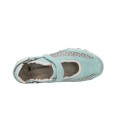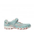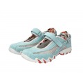 Corte realizado en material color turquesa, forro interior textil con plantilla extraíble para una mejor limpieza e higiene, cierre mediante velcro para un correcto ajuste y una buena sujección, suela de caucho amortiguadora con perfil especial GRIP para una sujeción segura.