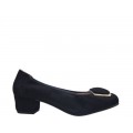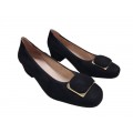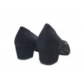 Descubre el equilibrio perfecto entre elegancia y confort con este zapato de corte salón para mujer, fabricado en ante negro y realzado con un sofisticado detalle metálico en el empeine.