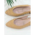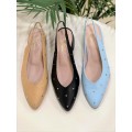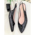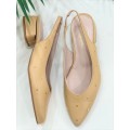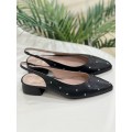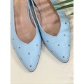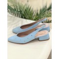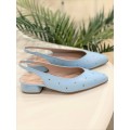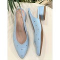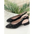 Zapato salón destalonado de la marca Calzados Roldan (Ragazza) R5351 en color negro, celeste o camel para mujer. Corte realizado en piel con detalle de tachuelas y destalonado, forro interior de piel con plantilla acolchada que ofrece una excelente transpiración, cierre mediante hebilla lateral a la altura del tobillo, suela de material sintético con tacón ancho de 4 cm forrado en piel.