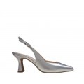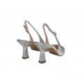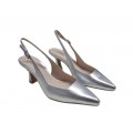 Corte realizado en piel con brillo color plata con puntera afilada, forro interior de piel con plantilla new gel para mayor comodidad, cierre mediante hebilla lateral que proporciona un buen ajuste, tacón con forma geométrica y una altura de 7.5 cm, suela sintética muy ligera y de gran adherencia para evitar los temidos resbalones.
