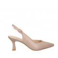 Corte realizado en piel color nude con diseño en punta y destalonado, escote cuadrado, forro interior de piel con plantilla new gel para mayor confort, cierre mediante hebilla lateral ajustable, tacón geométrico con una altura de 7 cm y suela sintética muy adherente y flexible.