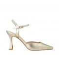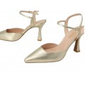 Deslumbra en tus eventos especiales con estos elegantes zapatos de salón destalonados de la marca Lodi. El color oro metalizado les confiere un brillo único que los hace perfectos para fiestas, eventos y celebraciones.