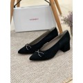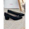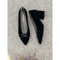 Zapato corte salón de la marca Hobby 403 en color negro para mujer. Corte realizado en ante con detalle metálico en el empeine, forro y plantilla interior de piel que proporcionan una correcta transpiración y un tacto suave, tacón ancho forrado en ante de 5.5 cm y suela de material sintético muy ligera, flexible y adherente.