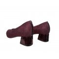 Corte realizado en licra suede color burdeos con puntera redonda, forro interior textil con plantilla acolchada extraíble muy confortable, tacón ancho de 4 cm forrado en charol haciendo contraste y suela sintética muy ligera y flexible.