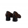Corte realizado en licra suede con estampado animal print y puntera redonda, forro interior textil con plantilla acolchada extraíble muy confortable, tacón ancho de 4 cm forrado en charol haciendo contraste y suela sintética muy ligera y flexible.