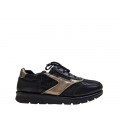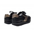 Corte realizado en piel natural con piezas en diferentes acabados combinando el tono negro con bronce, forro interior con plantilla extraíble, cierre mediante cordones y cremallera y suela sintética muy flexible y adherente.
