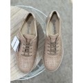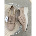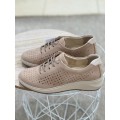 Zapato con estilo sport Harmony de la marca Suave By Leyland 3800 en color taupe. Corte realizado en piel natural con detalle de picados, forro interior de piel natural con plantilla anatómica extraíble, cierre mediante cordones al tono y suela de poliuretano con una altura de 4cm.